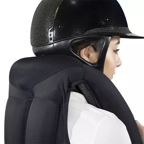 Mechanical system: reliable, simple and robust system. Simply hook the lanyard of the airbag vest to the saddle using the saddle strap. The airbag inflates when the lanyard is pulled off.